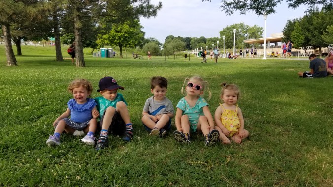 Saturday, we got to spend part of the day with some friends who were in town with their kids. In the morning, we started the day with a playground and park followed by lunch. That night, everyone came over to our house for a cookout. B made chicken, eggplant, green onions, and I made a salad and cookies to go along with the meal.