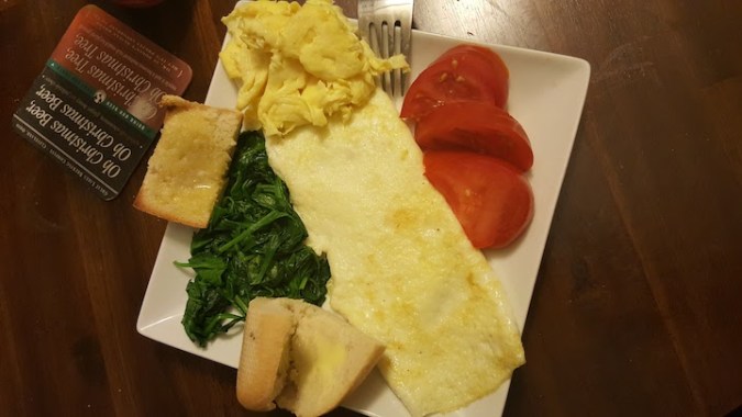 7:15 p.m.-7:45 p.m.: Got home and put FW to bed. While I was putting FW to bed, B was making dinner! We were having brinner.