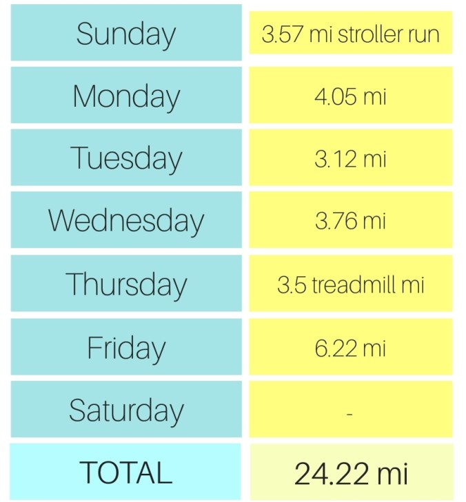 But who doesn’t love a good 5k fundraiser? So, I signed up on Wednesday and ran it Friday. Here’s how the week looked: